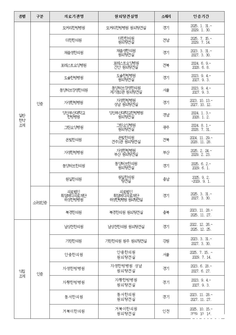 이번 공지에는 일반한약조제(소규모 인증 포함) 15곳, 약침조제 7곳이 포함됐으며 약침조제 가운데 인천 소재 거북이한의원 원외탕전실이 추가됐다.