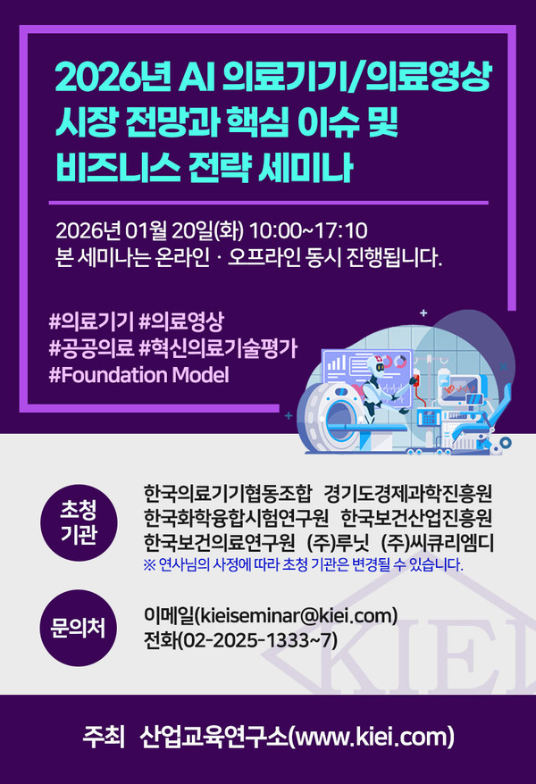산업교육연구소에서는 의료기기·의료영상 분야의 전문지식을 공유하고, 더 안전하며 신뢰할 수 있는 의료 AI 생태계를 구축하기 위해 ‘2026년 AI 의료기기·의료영상 시장 전망과 핵심 이슈 및 비즈니스 전략 세미나’를 개최합니다. 관계자 여러분의 많은 관심과 참여를 부탁드립니다.